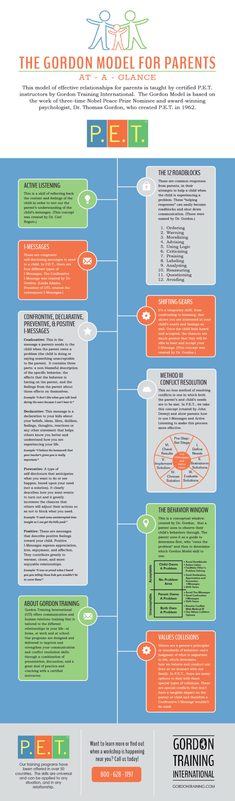 This model of effective relationships for parents is taught by certified P.E.T. Instructors by Gordon Training International. The Gordon Model is based on the work of three-time Nobel Peace Prize Nominee and award-winning psychologist, Dr. Thomas Gordon, who created P.E.T. in 1962. We created this Infographic so you can more easily follow the map of skills along with a brief description of each of the skills you will learn in Parent Effectiveness Training.
